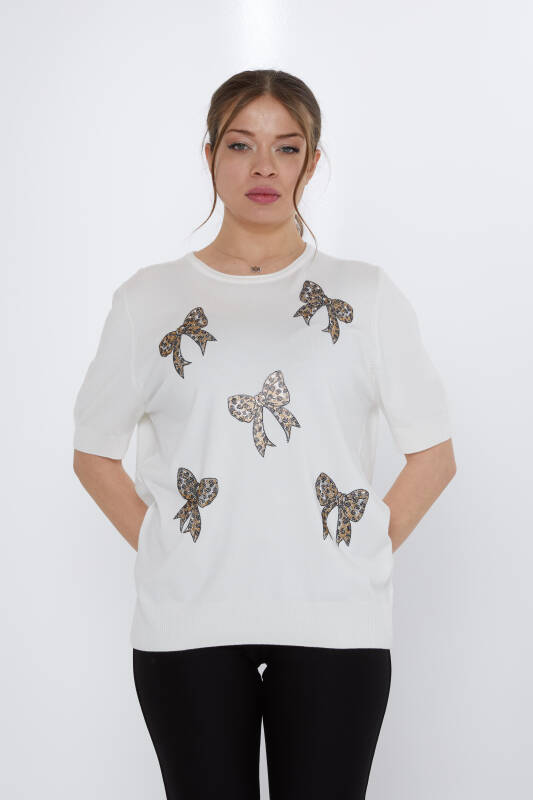 Tricotaj Pulover Fundă Stone Brodat Mânecă scurtă Ecru - 31577 | KAZEE (Set de 3 XL-2XL-3XL)