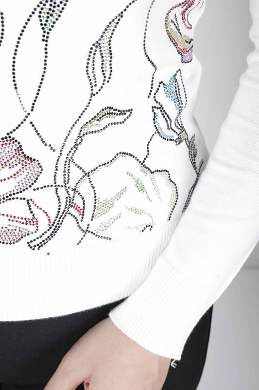Tricotaj Pulover Colorat Stone Brodat Guler Stand Ecru - 30593 | KAZEE (Set de 4 M-L-XL-2XL)