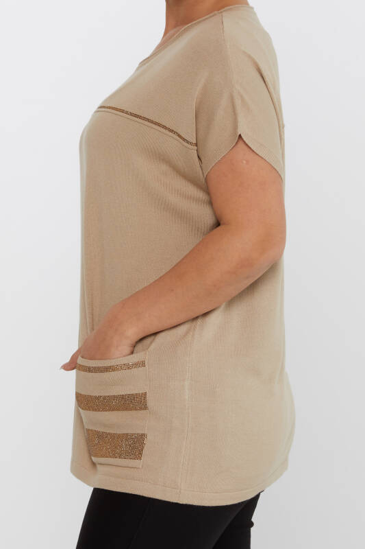 سترة تريكو بجيب ومفصلة حجر مطرز بيج - 30765 | كازي (مجموعة من 4 L-XL-2XL-3XL)