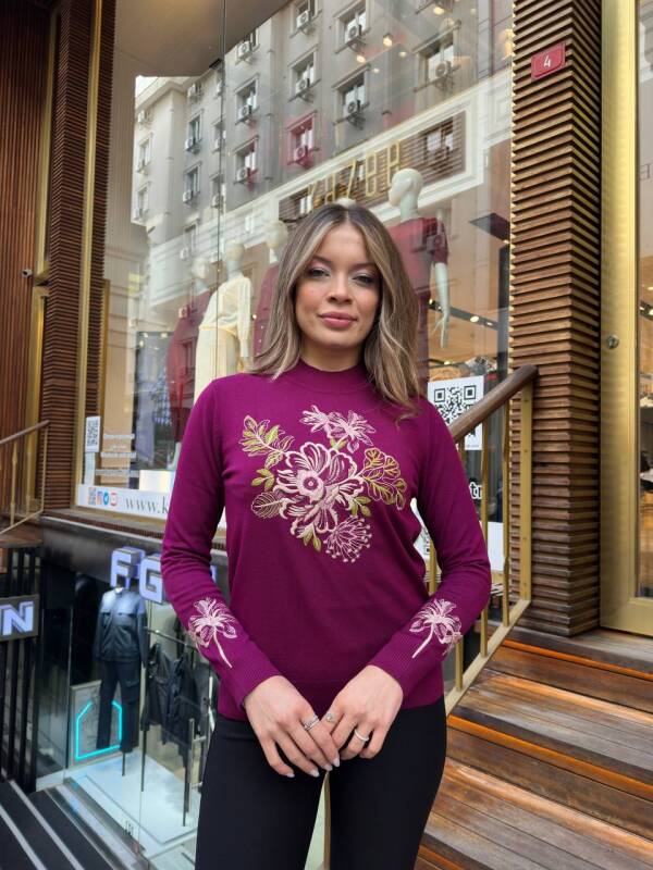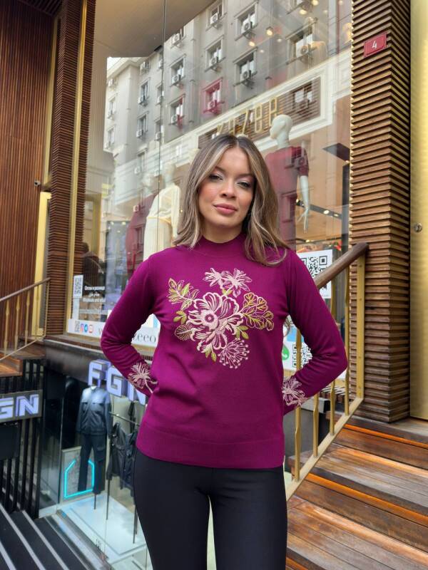 كنزة صوفية محبوكة بتطريزات زهرية وتزيينات حجرية، لون فوشيا - 32088 | كازي (طقم من 3 قطع، مقاسات M-L-XL)