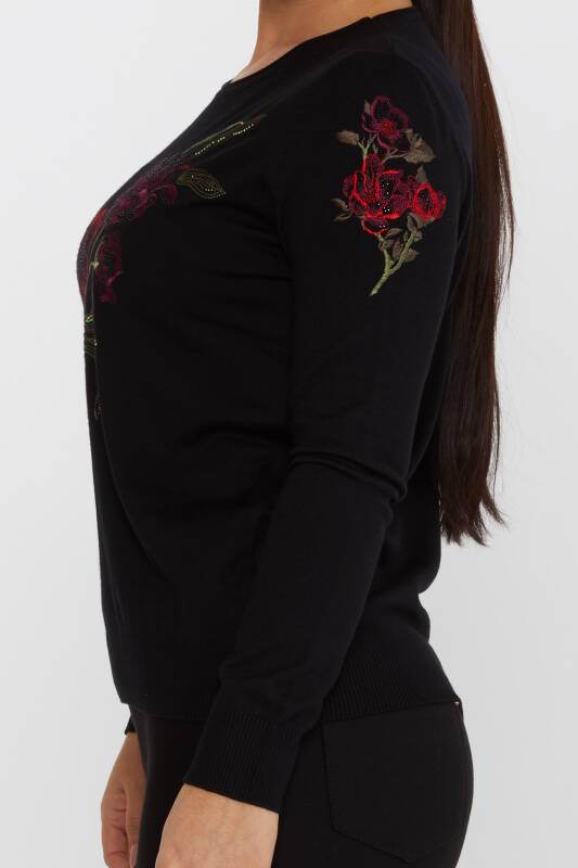 Triko Kazak Çiçek Nakışlı Taş İşlemeli Siyah - 31673 | KAZEE (3'lü Set L-XL-2XL)