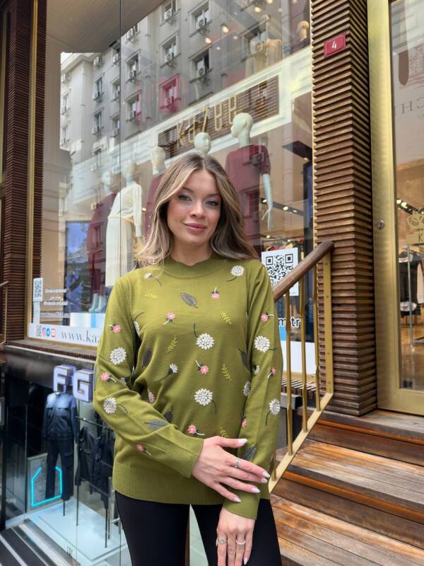 Triko Kazak Çiçek Nakışlı Yeşil - 32166 | KAZEE (3'lü Set L-XL-2XL)