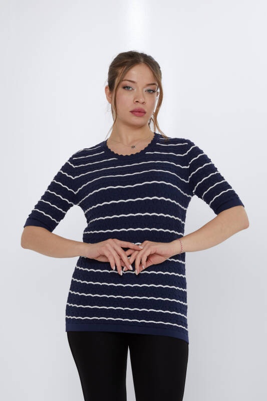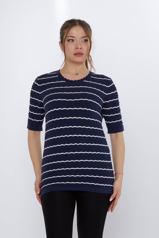 Triko Kazak Çizgi Detaylı Ajurlu Lacivert-Ekru - 31778 | KAZEE (3'lü Set M-L-XL)