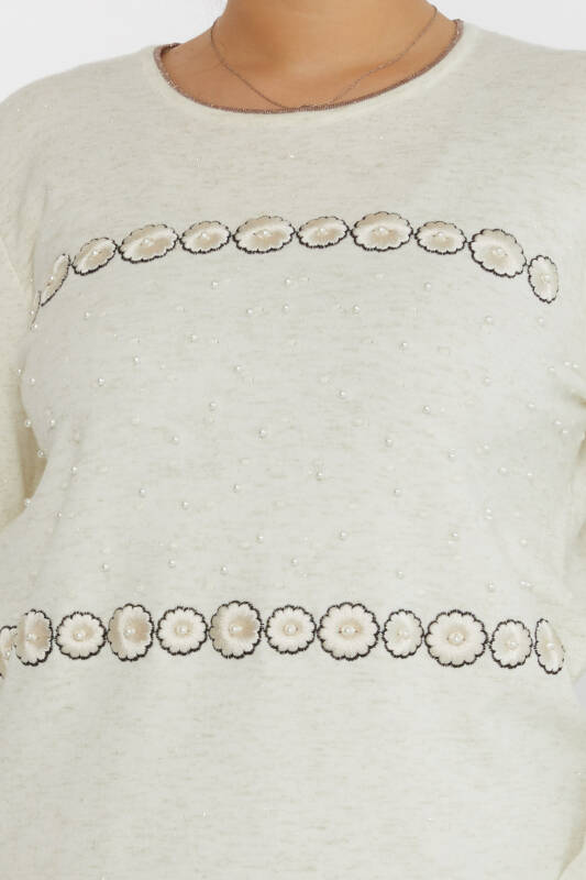 Triko Kazak İnci İşlemeli Çiçek Nakışlı Ekru - 31719 | KAZEE (3'lü Set XL-2XL-3XL)