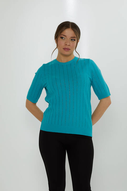Triko Kazak Kısa Kollu Şerit Taş İşlemeli Turkuaz - 31094 | KAZEE (3'lü Set M-L-XL)