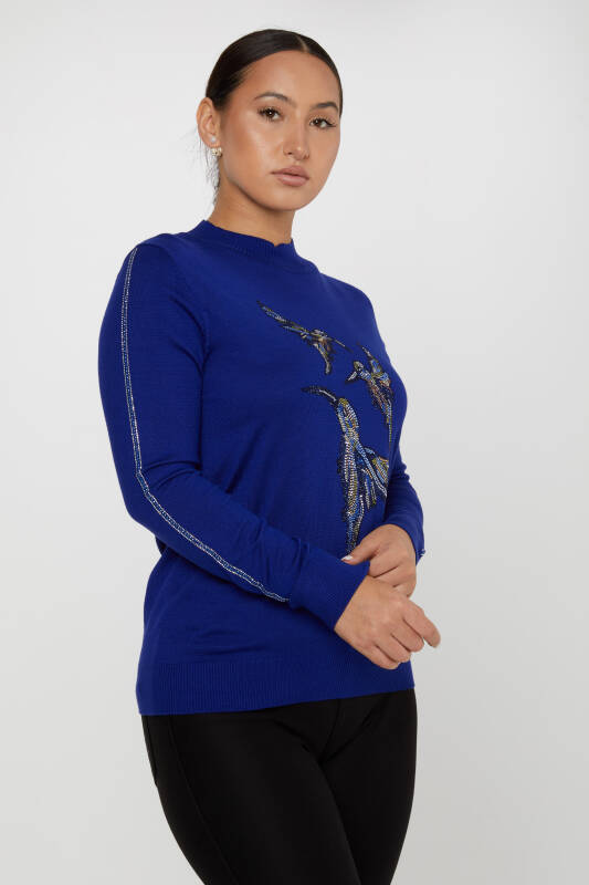 Triko Kazak Kuş Desenli Taşlı Saks - 31038 | KAZEE (4'lü Set L-XL-2XL-3XL)