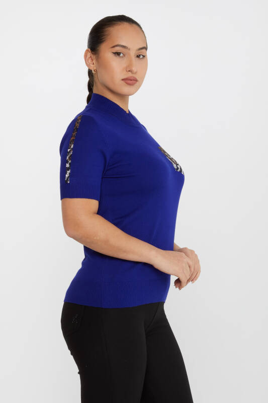 Triko Kazak Leopar Taş İşlemeli Saks - 31623 | KAZEE (4'lü Set M-L-XL-2XL)