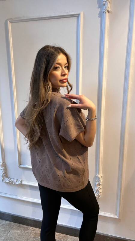 Triko Kazak Taş İşlemeli Kısa Kollu Bej - 31920 | KAZEE (3'lü Set L-XL-2XL)