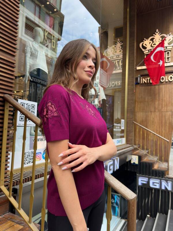 Triko Kazak Taş İşlemeli Fuşya - 32209 | KAZEE (3'lü Set L-XL-2XL)