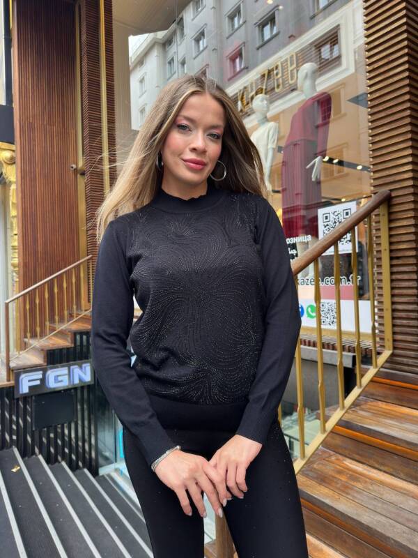 Triko Kazak Taş İşlemeli Dik Yaka Siyah - 32065 | KAZEE (3'lü Set L-XL-2XL)