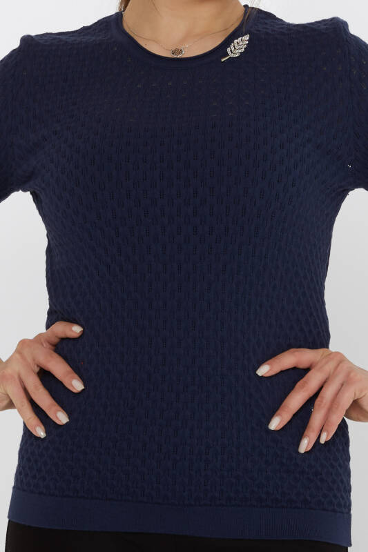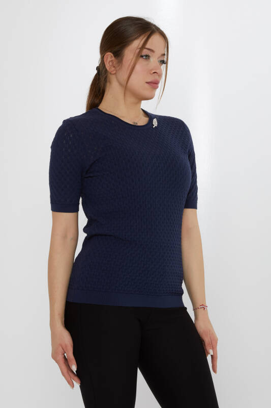 Triko Kazak Yaprak Broşlu Kısa Kollu Lacivert - 31811 | KAZEE (3'lü Set M-L-XL)