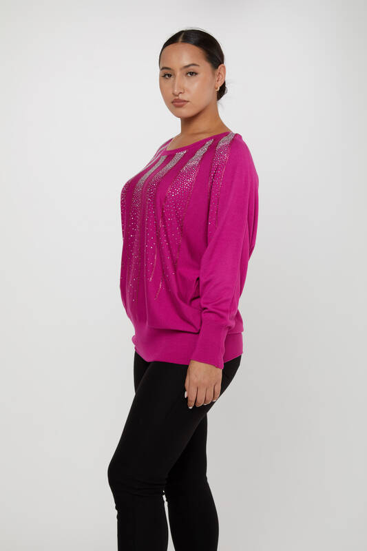 سترة محبوكة بأكمام خفاش مطرزة بالأحجار باللون الفوشيا - 30675 | كازي (مجموعة من 4 مقاسات L-XL-2XL-3XL)