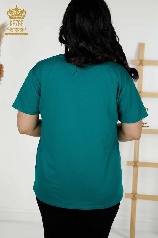 Camicetta da donna all'ingrosso motivo floreale pietra ricamata manica corta verde - 79369 | KAZEE