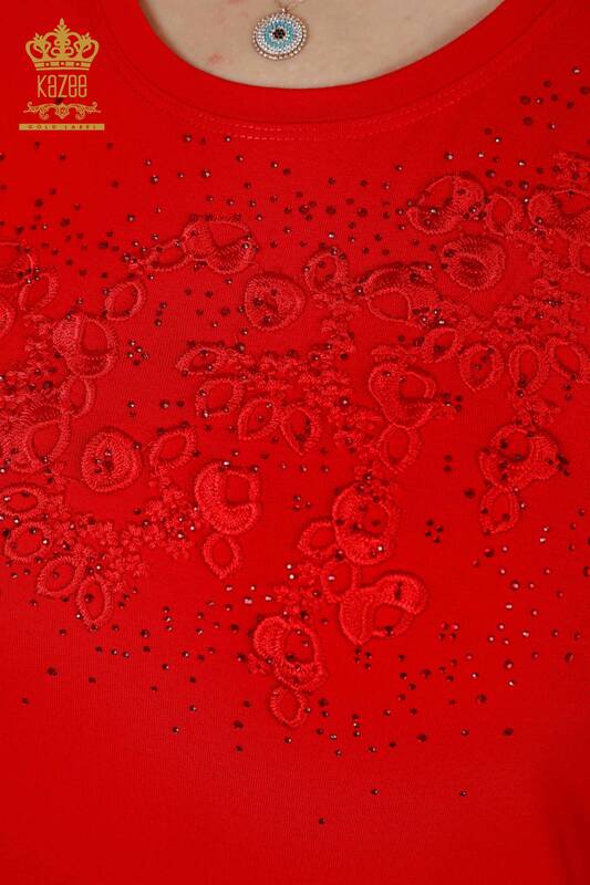 Camicetta da donna all'ingrosso motivo floreale ricamato in pietra di cristallo rosso - 79010 | KAZEE