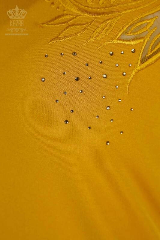 Camicetta da donna all'ingrosso motivo floreale manica corta pietra ricamata zafferano - 79093 | KAZEE