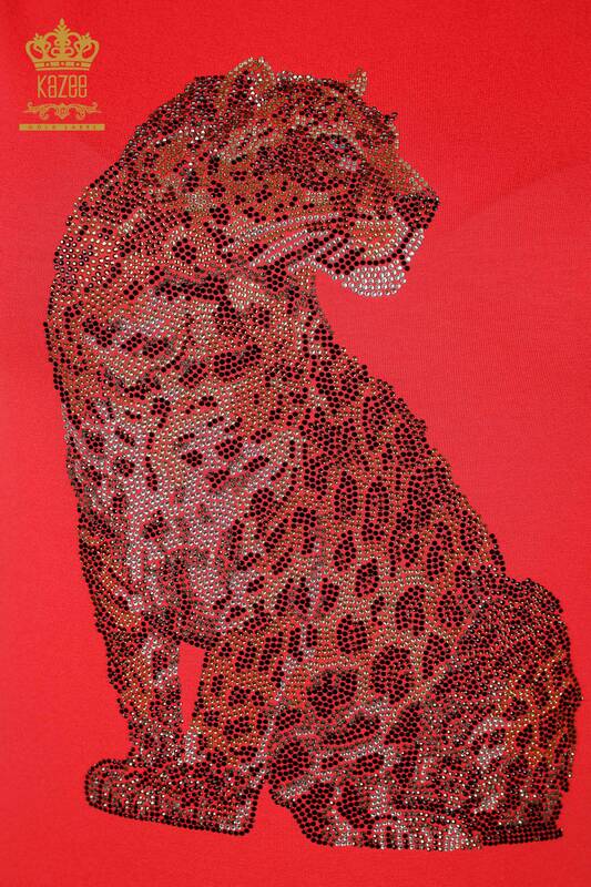 Camicetta da donna all'ingrosso motivo leopardo pietra ricamata manica corta corallo - 78942 | KAZEE