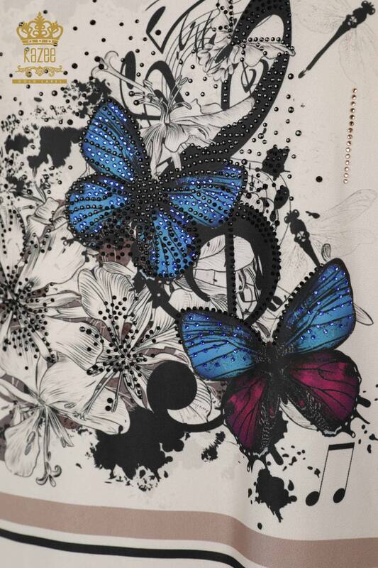 Camicetta da donna all'ingrosso stampa digitale pietra ricamata manica corta nera - 12039 | KAZEE