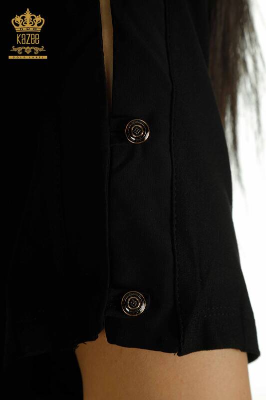 Commercio all'ingrosso camicetta da donna pietra ricamata spalla pulsante dettagliato nero - 79221 | KAZEE
