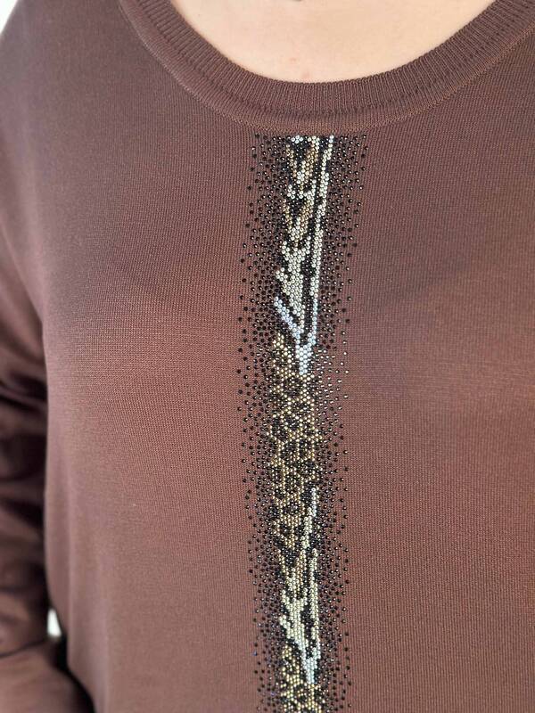 Venta al por mayor de punto de mujer suéter bolsillo detallado piedra bordado leopardo estampado cuello redondo marrón - 30621 | KAZEE