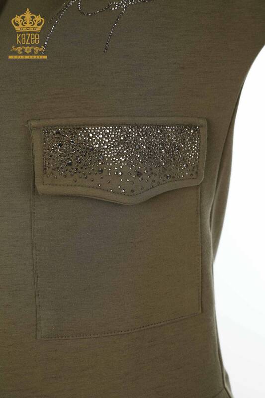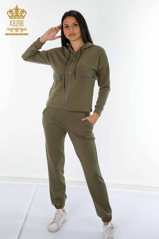 Venta al por mayor Conjunto de chándal para mujer con capucha y bolsillo con piedras preciosas bordadas de color caqui - 17426 | kazee
