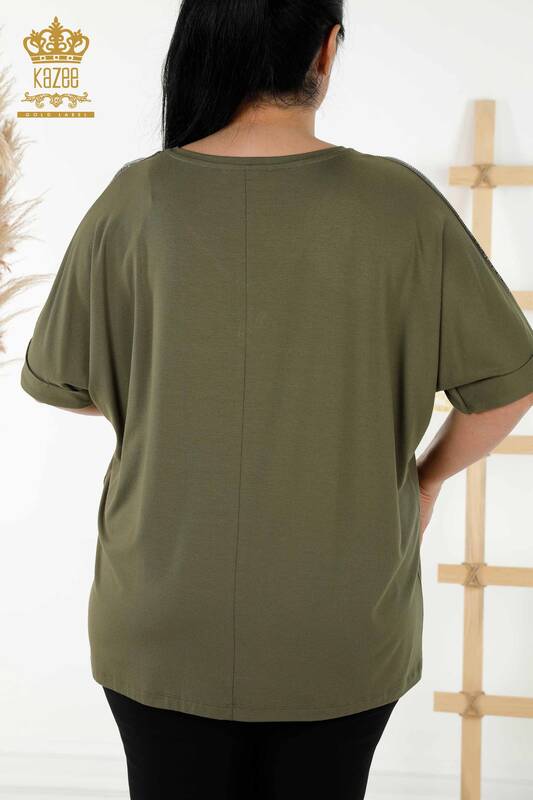 Grossiste Chemisier Femme Col V Manches Courtes Pierre Brodée Kaki - 78882 | KAZEE