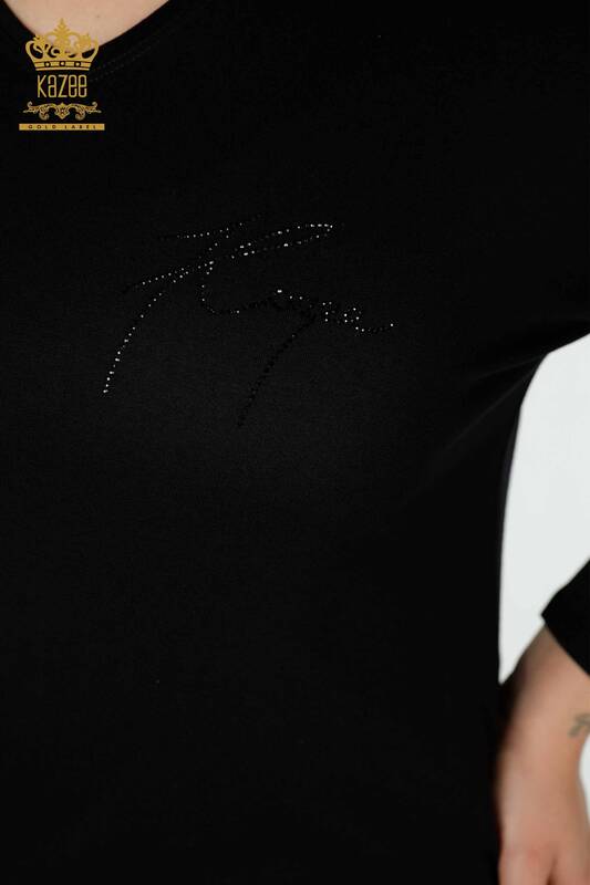 Vente en gros de chemisier femme Kazee détaillée cristal pierre brodé col en V noir - 77935 | KAZEE