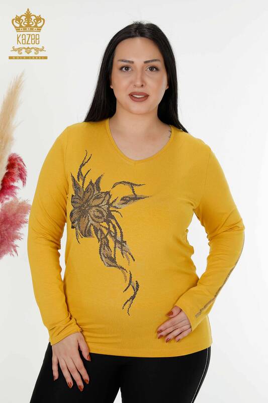 Grossiste Chemisier Femme Cristal Pierre Brodée Motif Floral Safran - 79048 | KAZEE