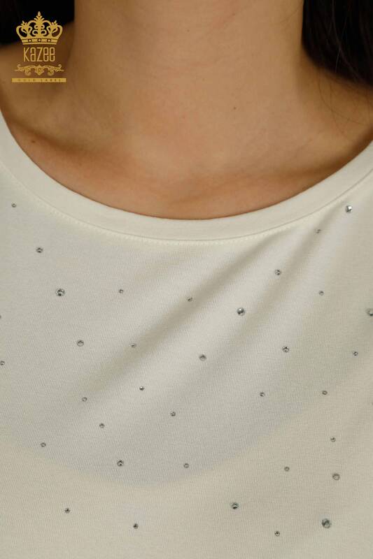 Grossiste Femme Chemisier Deux Poches Manches Courtes Pierre Brodée Ecru - 79293 | KAZEE