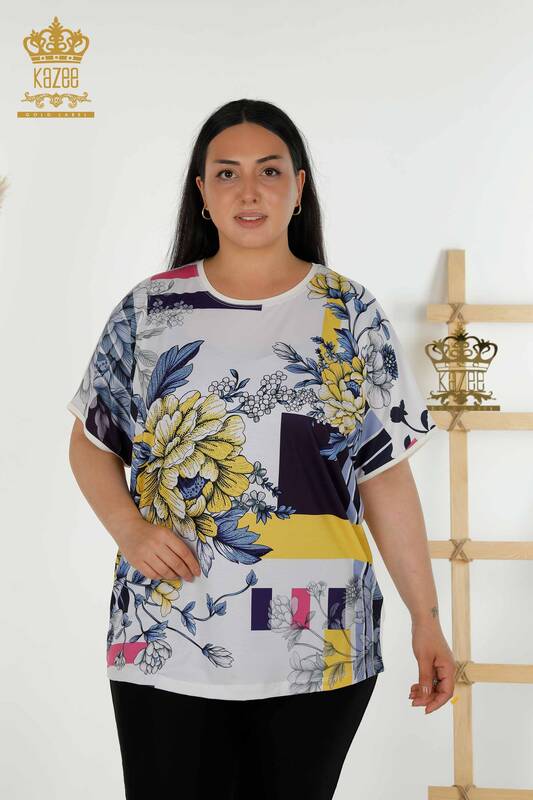 Vente en gros Chemisier Femme Manches Courtes Pierre Brodée Impression Numérique - 12079 | KAZEE