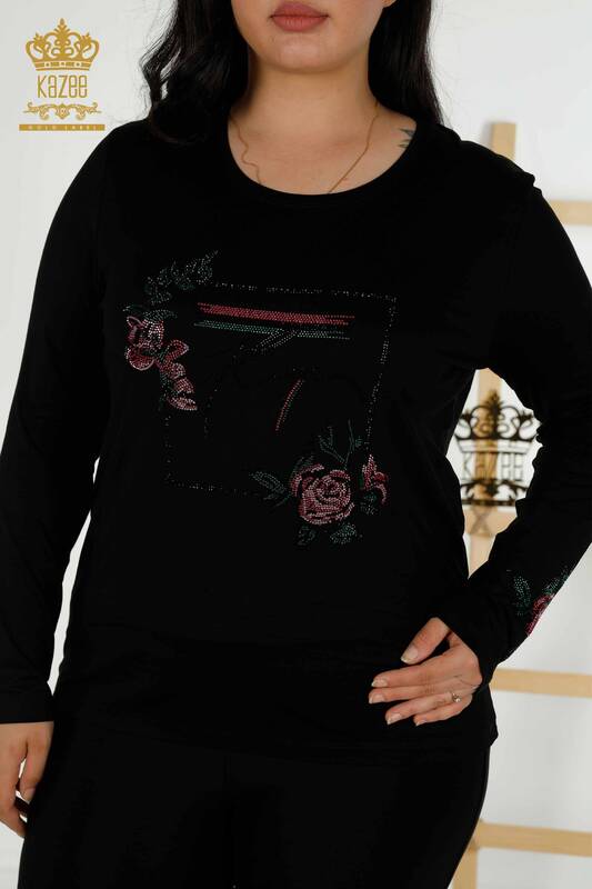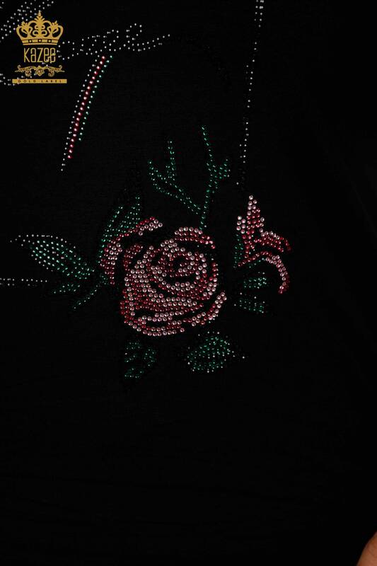 Grossiste Chemisier Femme Motif Floral Pierre Brodée Noir - 79042 | KAZEE