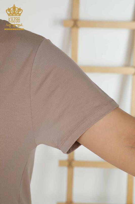 Grossiste Chemisier Femme Motif Floral Pierre Brodée Manches Courtes Vison - 79369 | KAZEE