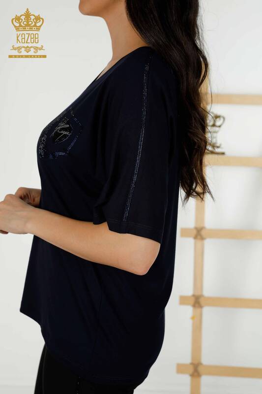 Grossiste Femme Chemisier Pierre Brodé Poche Détaillée Bleu Marine - 77487 | KAZEE