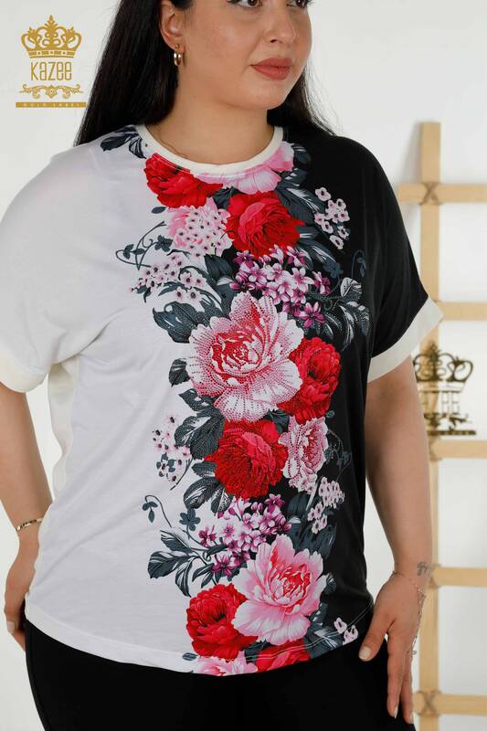 Vente en gros Chemisier Femme Manches Courtes Pierre Brodée Impression Numérique - 12080 | KAZEE