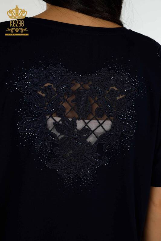 Grossiste Chemisier Femme Tulle Détaillé Manches Courtes Pierre Brodée Bleu Marine - 79390 | KAZEE