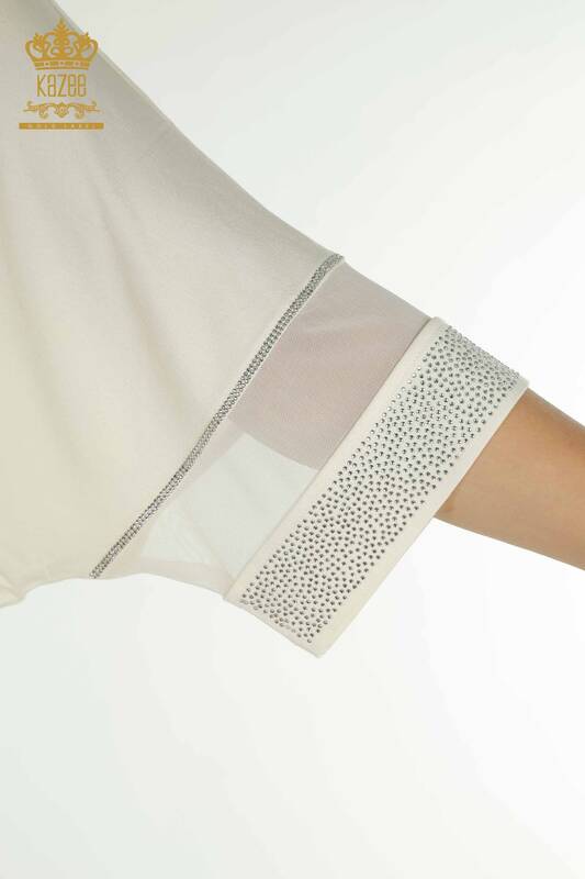 Grossiste Femme Chemisier Fleur Motif Pierre Brodé Tulle Détaillé Ecru - 79298 | KAZEE