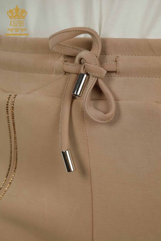 Ensemble de survêtement pour femmes en gros avec capuche zippée et pierre brodée beige - 17618 | KAZÉE