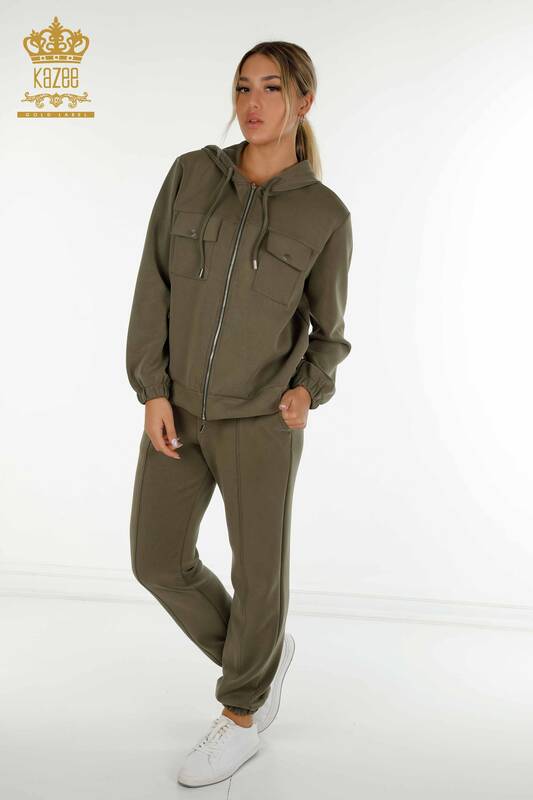 Ensemble de survêtement pour femmes en gros zippé boutonné à capuche kaki - 17620 | KAZÉE