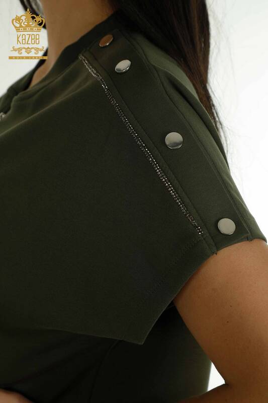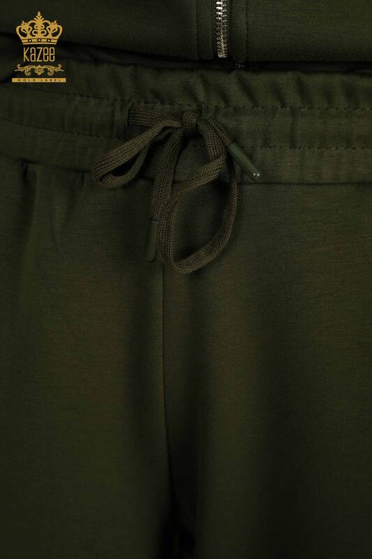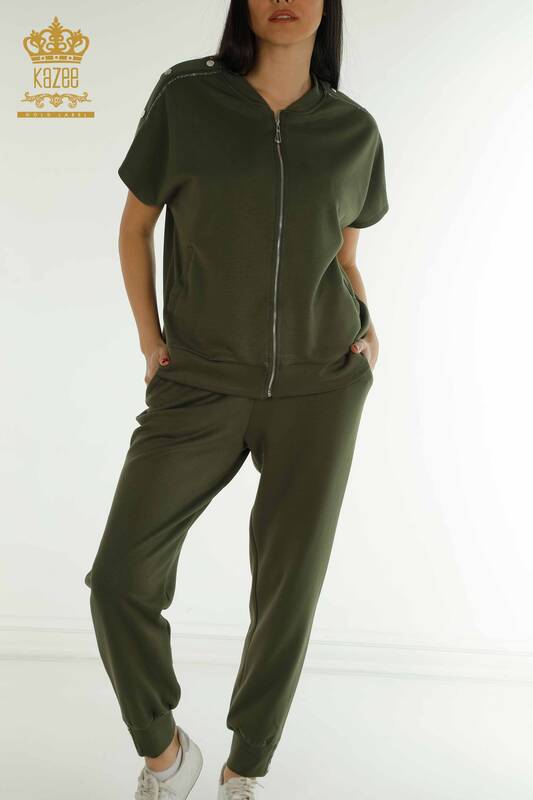 Ensemble de survêtement pour femmes en gros à manches courtes et fermeture éclair brodée de pierre kaki - 17680 | KAZÉE