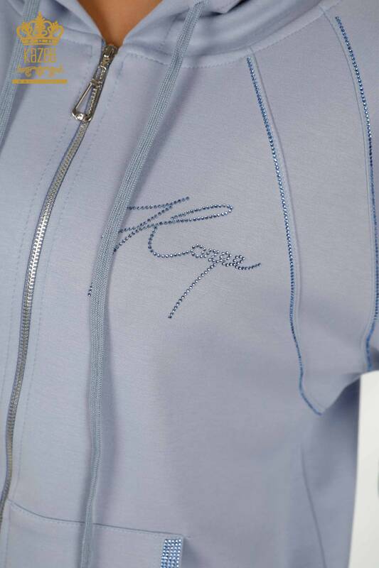 Ensemble de survêtement pour femmes en gros avec fermeture éclair à broderie de pierre à capuche bleu - 20415 | KAZÉE