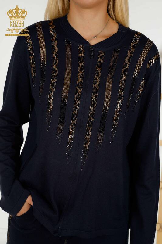 Ensemble de survêtement pour femmes en gros avec poches zippées Pierre brodée bleu marine - 16280 | KAZÉE