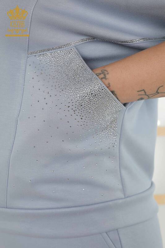 Vente en gros Ensemble Survêtement Femme Manches Courtes Zippée Pierre Brodée Bleu - 17547 | KAZEE