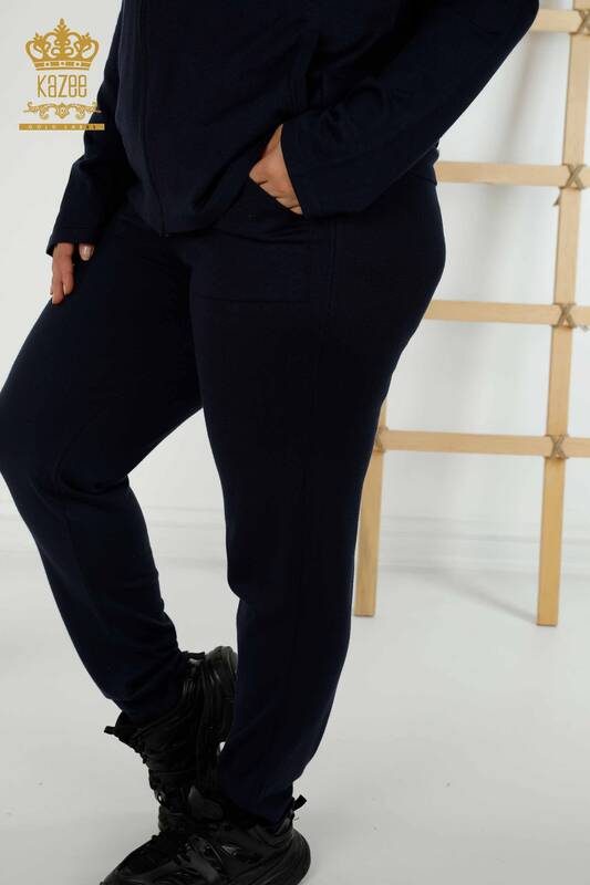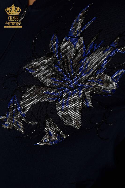 Vente en gros Ensemble de survêtement pour femmes Floral Patterned Pockets Zippered Navy Blue - 16661 | KAZEE