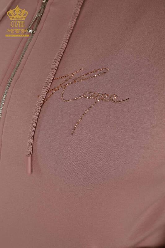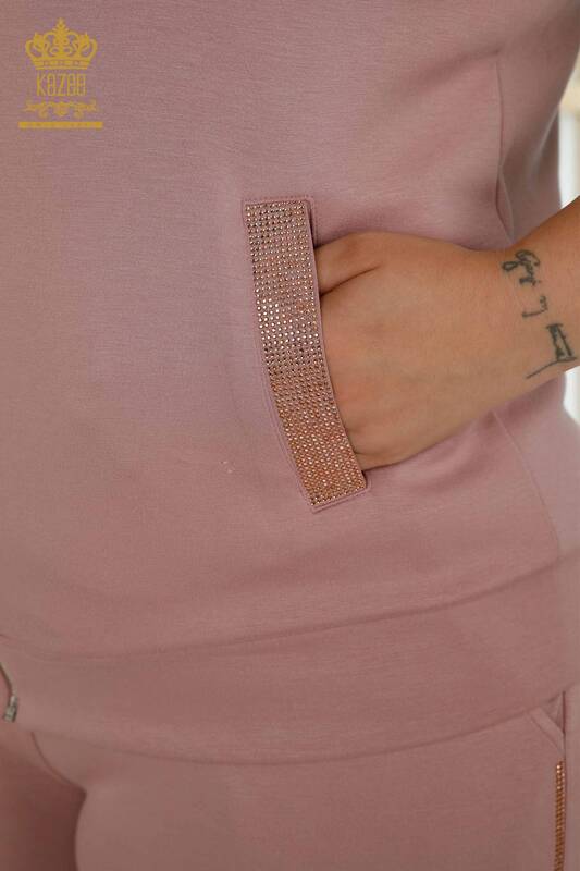 Vente en gros Ensemble de survêtement pour femme avec capuche et poche brodée de pierres roses séchées - 20392 | KAZEE