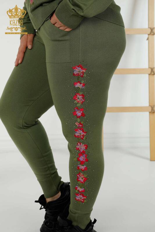 Grossiste Ensemble Survêtement Femme Motif Floral Pierre Brodée Kaki - 16658 | KAZEE