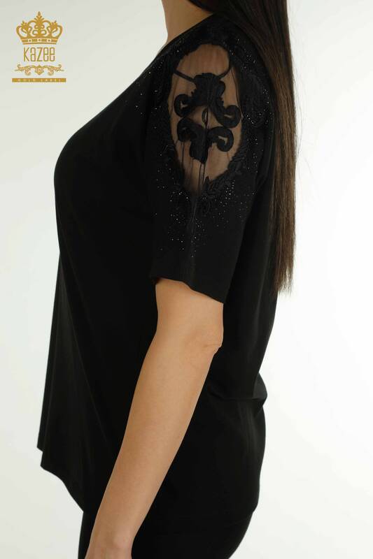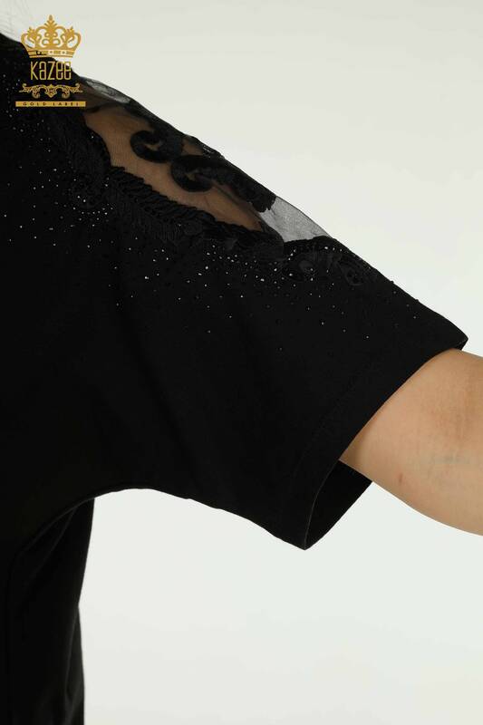 Chemisier Femme En Gros Épaule Tulle Détail Pierre Brodée Manches Courtes Noir - 79553 | KAZÉE