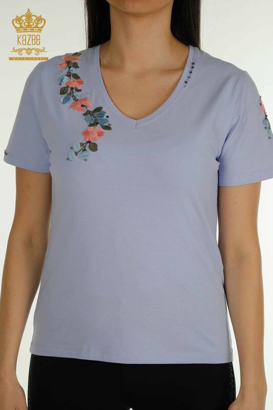 Chemisier Femme En Gros Fleur Colorée Brodée Manches Courtes Col V Lilas - 79455 | KAZÉE