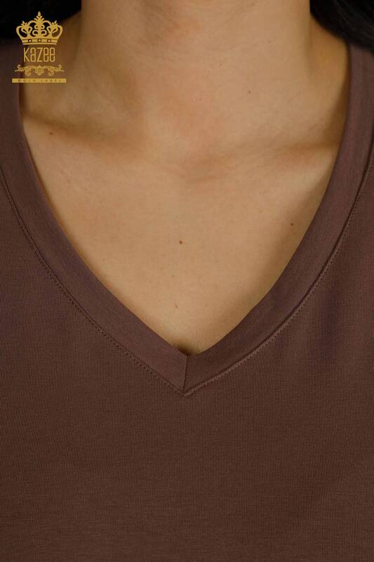 Chemisier Femme Manches Courtes Pierre Brodée Col V Marron - 79561 | KAZÉE