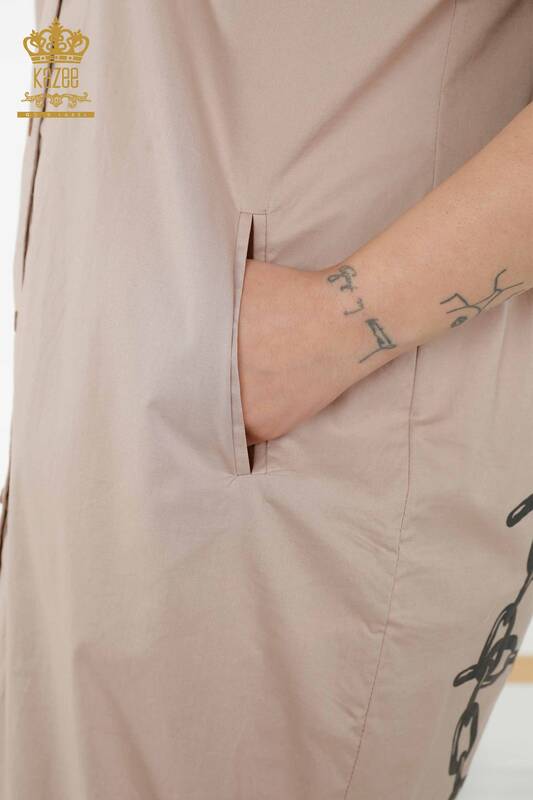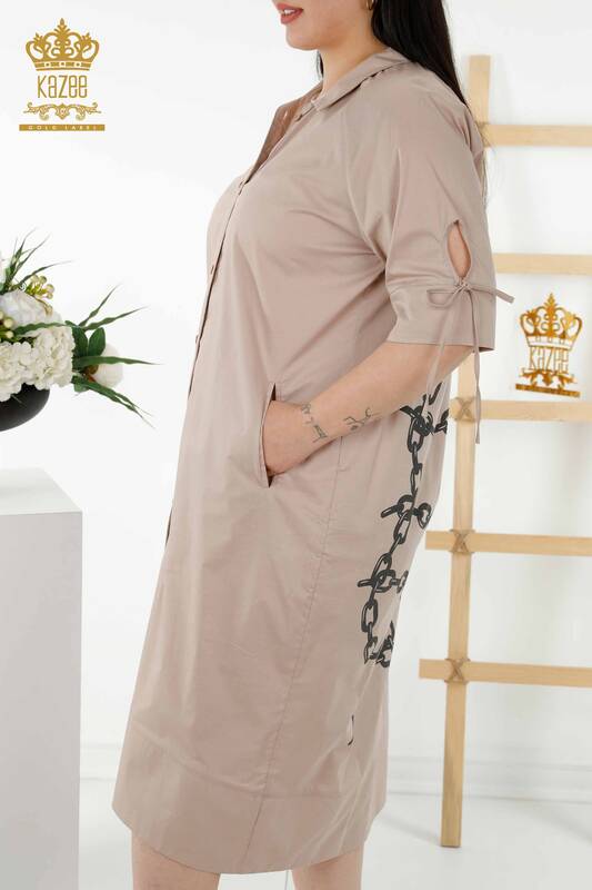 Grossiste Robe Chemise Femme Avec Poche Motif Chaîne Beige - 20379 | KAZEE