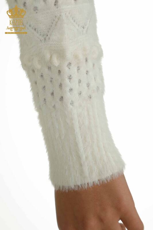 Grossiste Maille Femme Pull Angora Col V Perforé Ecru - 30697 | KAZÉE