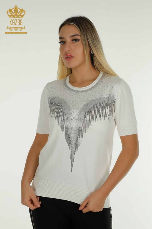 Grossiste Maille Pull Crystal Stone Brodé Modèle Américain Ecru - 30330 | KAZÉE